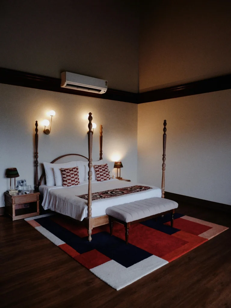 Hello, statement rug! This room blends classic furniture with a huge splash of modern art deco flair. The four-poster bed and cushioned bench are traditional, but the oversized, geometric area rug in red, white, and navy instantly makes the space cool and contemporary. It’s an awesome example of mixing styles for a totally unique result.