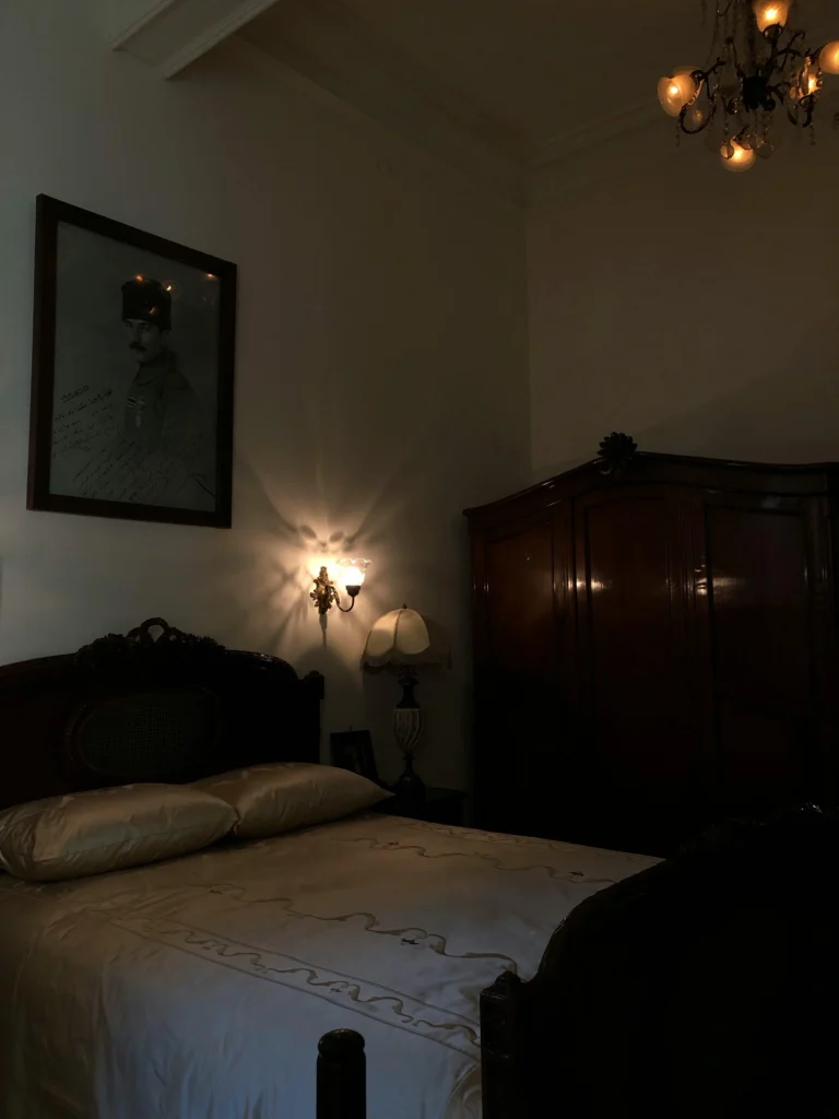 This room has a definite sense of history and classic drama! The dark wood furniture, from the wardrobe to the beautiful bed frame, feels very grand. The low, moody lighting from the wall sconces and chandelier enhances the opulent atmosphere, while the portrait adds a fascinating, formal focal point. It feels like stepping into a beautiful past.