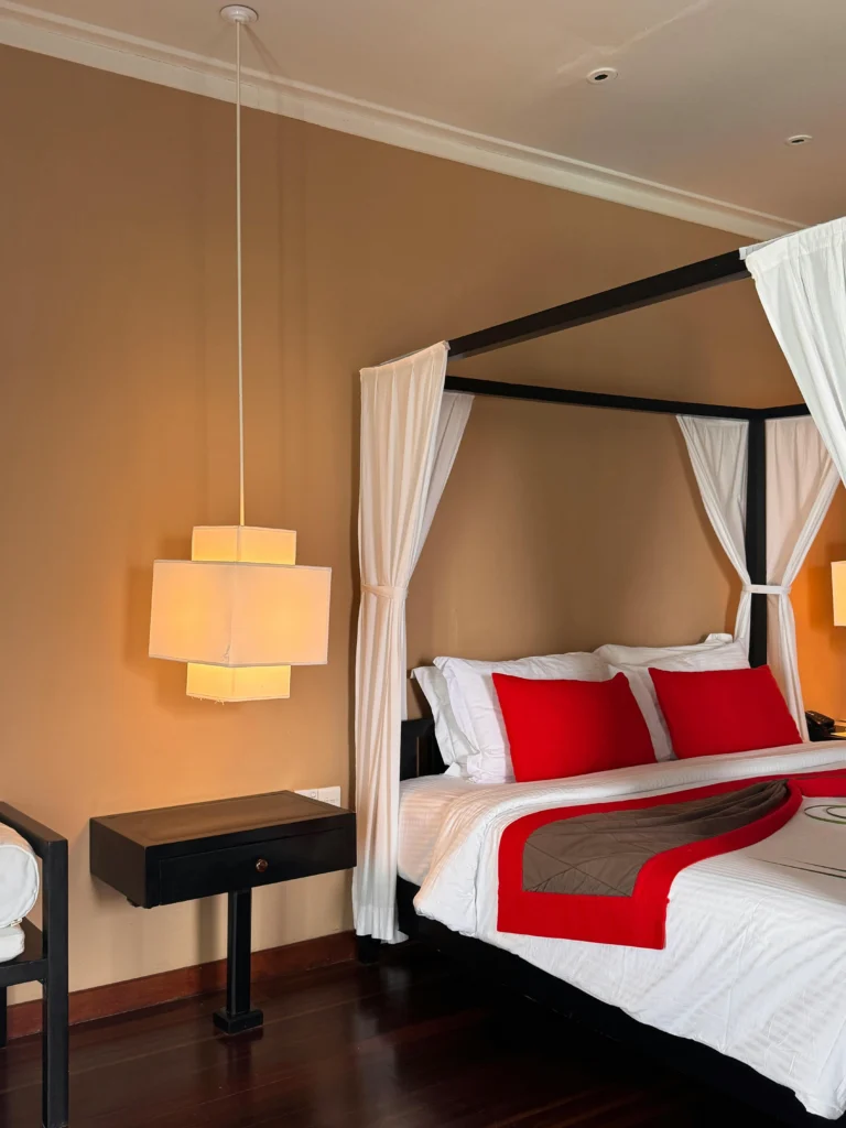 This room has a chic, global hotel vibe! The deep caramel wall paired with the black four-poster bed is instantly elegant. The use of crisp white curtains and bedding keeps the look from being too heavy, while the vibrant red pillows provide a striking color contrast against the dark background. The modern, geometric pendant lamp is the perfect clean finish.