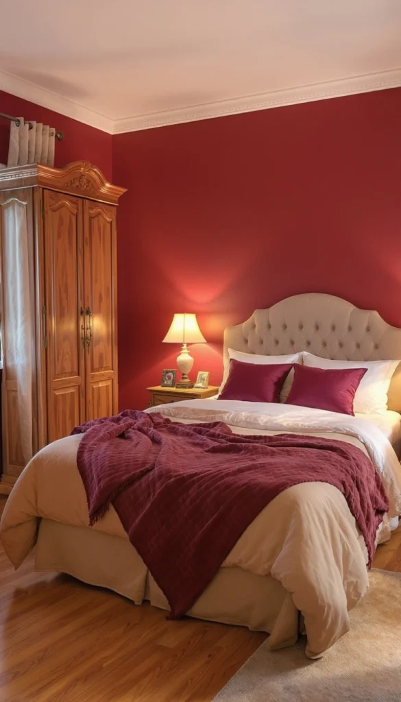 This is an incredibly rich and romantic look! The deep burgundy-red wall creates immediate drama and warmth. The luxurious wood wardrobe and side table add a classic, antique feel that complements the rich color. The tufted headboard and plush bedding invite you to cozy up, making this a truly intimate and sophisticated retreat.