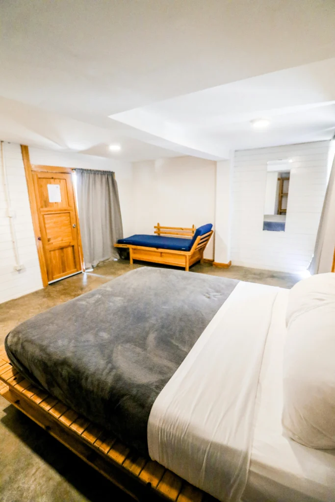 This space is all about raw simplicity and light. The light wood accents, like the door and the slatted bed frame, bring in a lovely, natural texture. The mostly white walls and light grey accents keep the space feeling open and clutter-free. It’s a very practical, clean, and functional room with a subtle, rustic charm.
