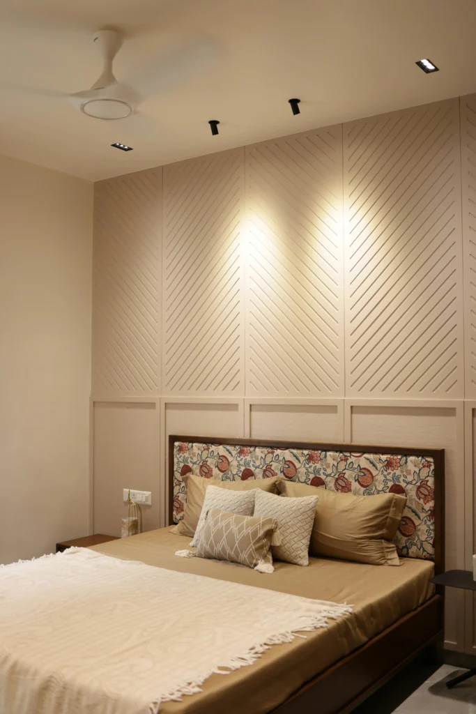 I love the subtle sophistication here! This room proves you don’t need bright color for drama. The fantastic feature wall with the diagonal paneling adds incredible depth and pattern in a super-neutral tone. The mix of gold and patterned pillows, along with the beautiful printed headboard, keeps the look rich and complex without being overwhelming.