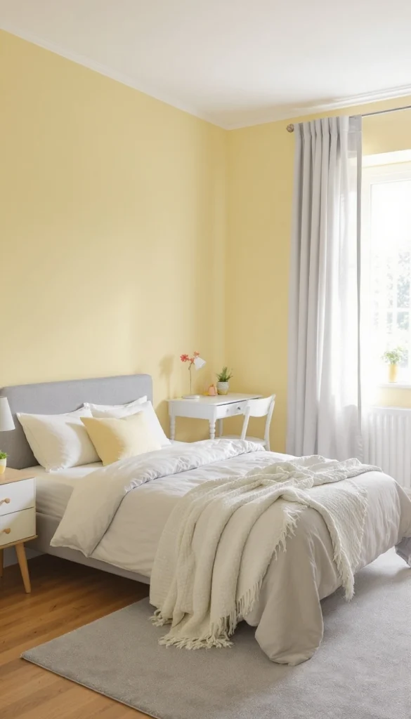 If you love bright color but want a calming effect, this is it! The subtle pastel yellow on the wall is ultra-gentle, almost like sunlight filtering through the curtains. Paired with soft greys and creams, the room feels incredibly serene and calm. This is a beautiful, easy-to-live-with color palette that promotes relaxation.