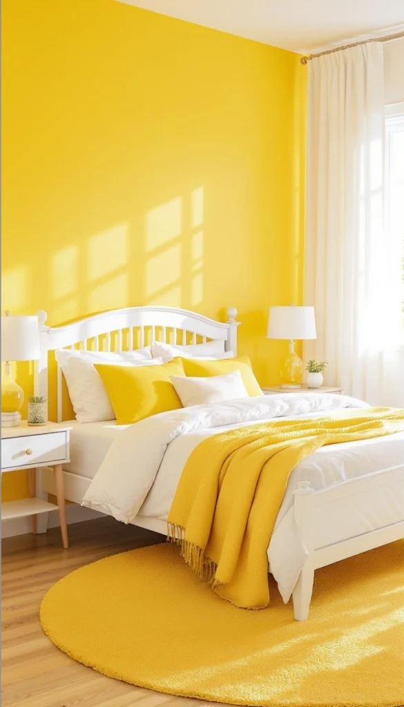 • Contrasting White: Use lots of pure white for the bed frame, bedding, and lamps to make the yellow pop.