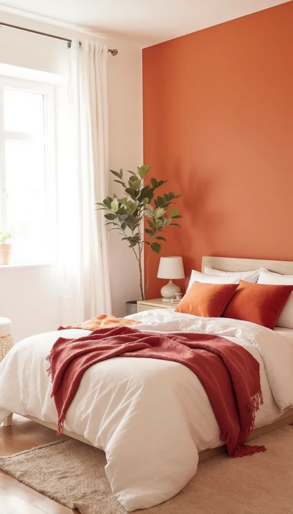 Wow, this terracotta accent wall is stunning! It’s warm, inviting, and feels totally grounding. This earthy orange-red is a fabulous alternative to a plain neutral. The vibrant throw and pillows are perfectly matched, creating a cohesive, cozy vibe. The bright window and light bedding ensure the rich color doesn’t feel heavy.