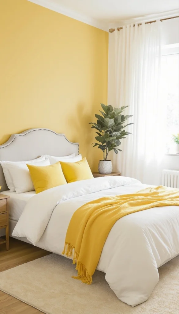 • Simple Bedding: Stick to white bedding and use only a couple of yellow pillows and a throw to highlight the wall color.
