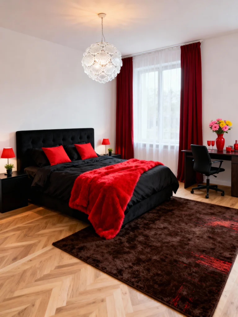 Here’s another take on a red room, but with a much moodier vibe. The rich, dark accents—like the black bedding and area rug—turn the bright red into a dramatic, high-contrast look. The interesting globe chandelier and dark wood furniture add a sophisticated, almost theatrical feel. This isn’t just a bedroom; it’s a cozy, glamorous retreat.