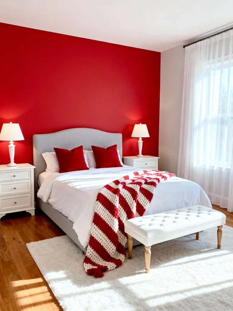 This room is a total showstopper! That vibrant fire engine red accent wall brings a massive energy boost. By keeping the bedding, rug, and trim crisp white, the look stays fresh and not overwhelming. The throw blanket and pillows perfectly tie the two colors together, adding a cozy texture. This is a bold, passionate, and energetic bedroom that screams confidence.