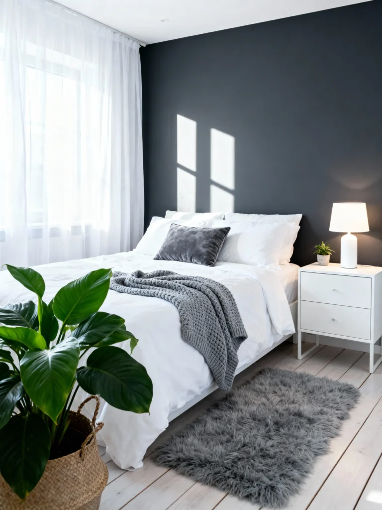 If you love a clean, sophisticated vibe, this one’s for you. The charcoal gray accent wall is moody and modern, but the bright white bedding and curtains keep the space from feeling too dark. A simple gray throw and pillow maintain the sleek, monochromatic palette. The giant fiddle-leaf fig plant is the perfect way to add a much-needed splash of fresh, vibrant color.