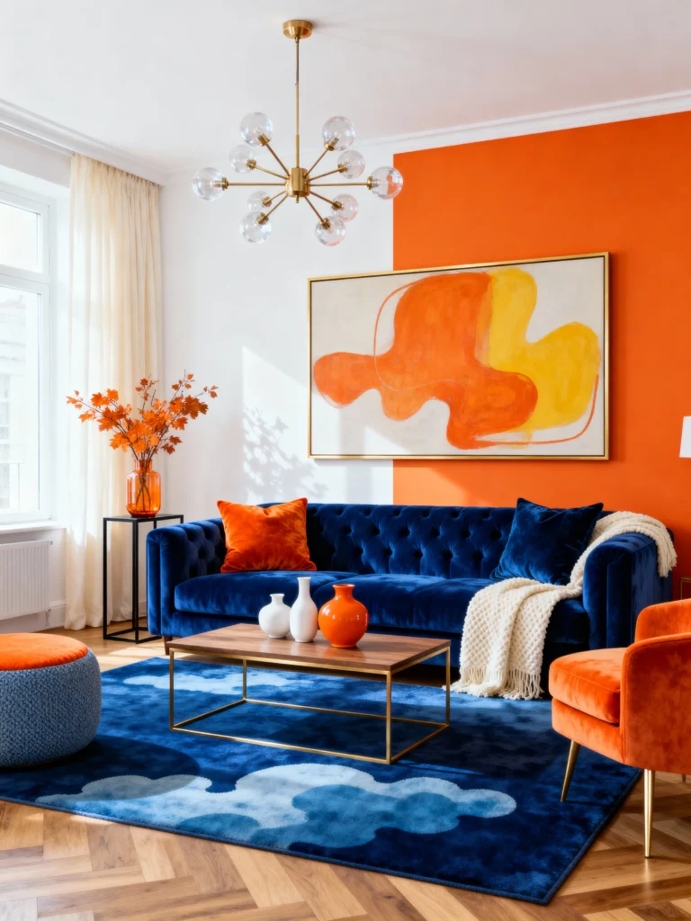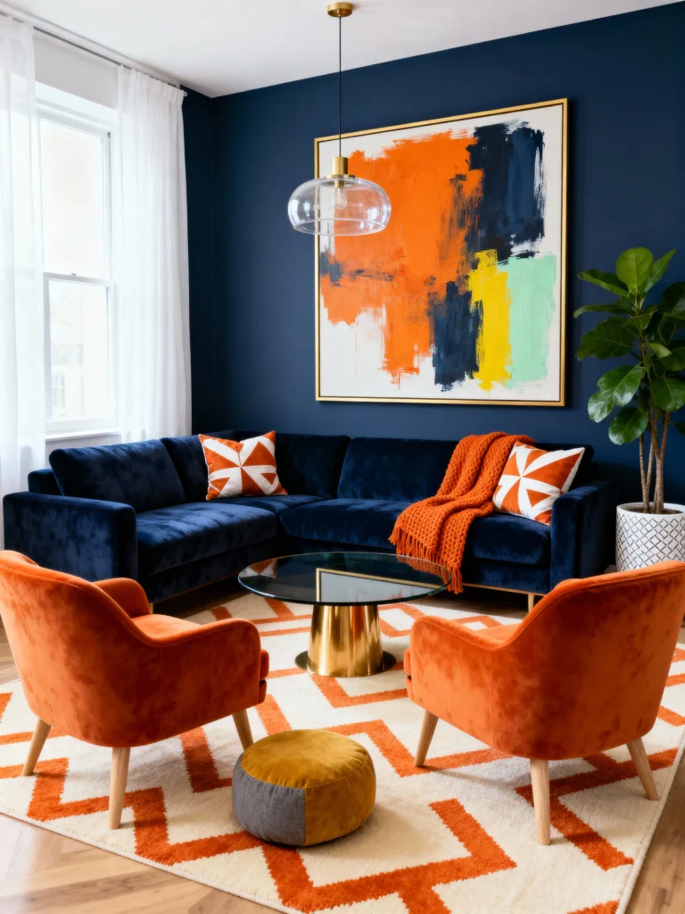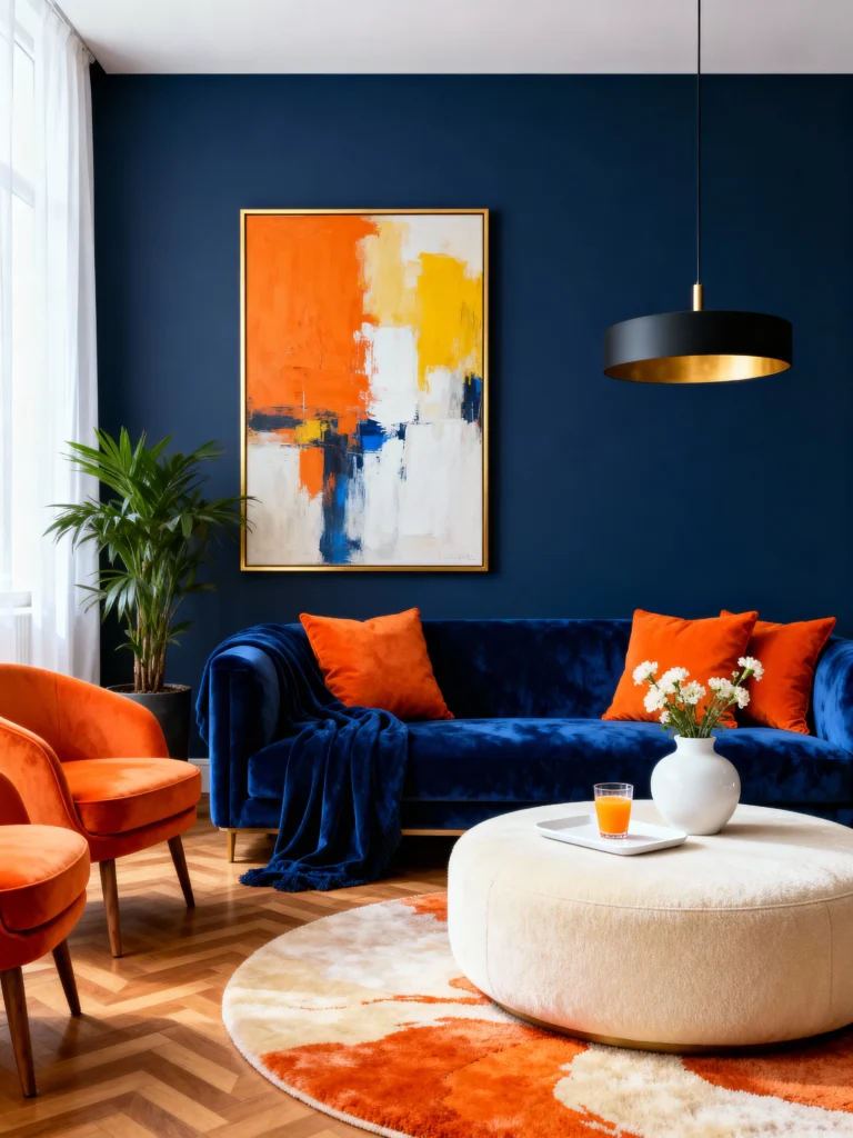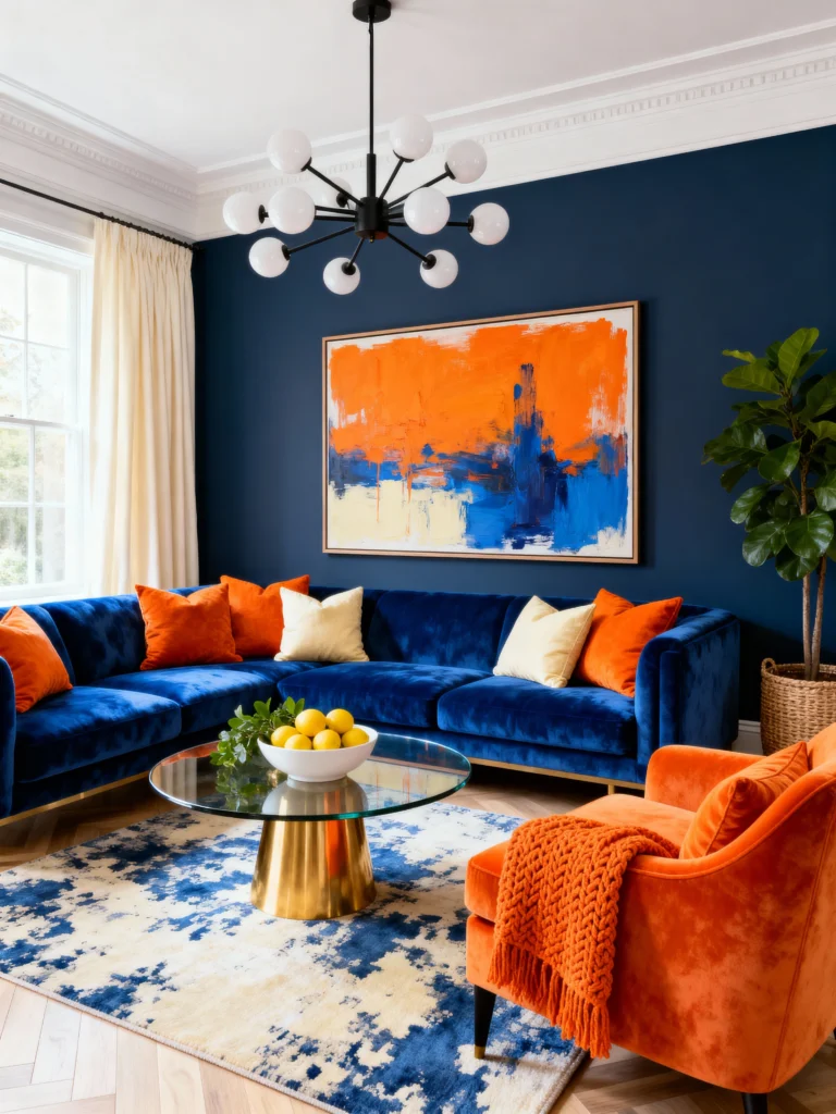- Art Focus: Hang a large, abstract painting over the sofa that incorporates all your key colors (blue, orange, and a touch of yellow).
