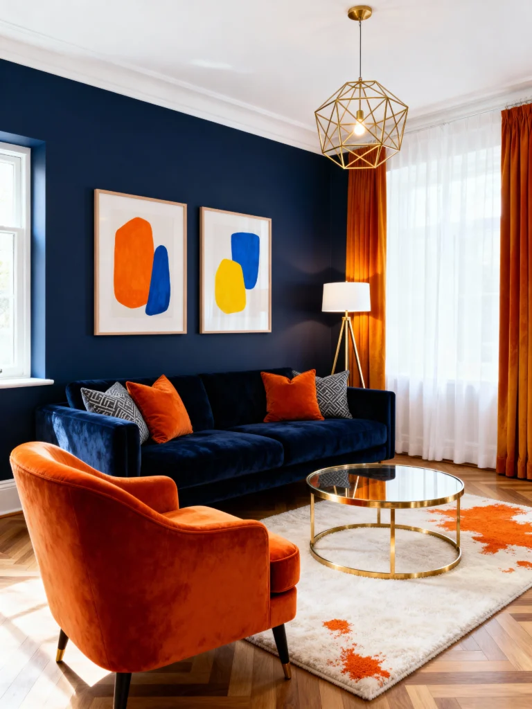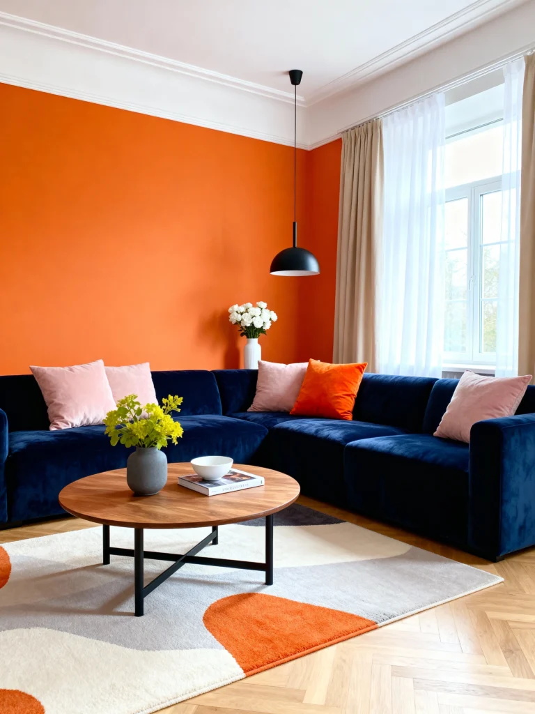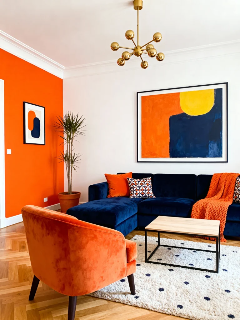 I love how the orange accent wall is used here—it feels so sunny and warm! The clean lines of the navy sofa and the modern, geometric artwork balance the intensity of the orange. Using a white rug helps keep the floor area light and airy, letting the colors on the walls and furniture do all the talking.