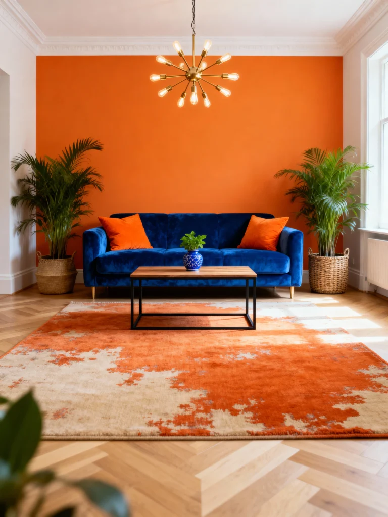 This space is so welcoming and warm! The solid orange accent wall paired with the navy sofa creates that lovely complementary contrast. The oversized orange and rust patterned rug brings a bohemian, autumnal feel to the whole room. It’s a great example of how to make a bold color palette feel cozy and lived-in.