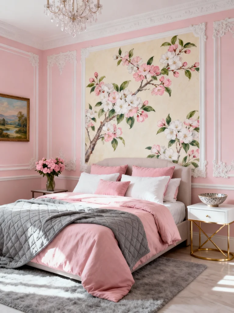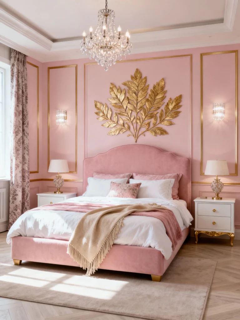 Wall decor can really make your blush pink and gold bedroom shine. A piece like a floral canvas adds a touch of glamour while keeping things minimalist. It’s all about finding art that complements your style and makes you feel at home.