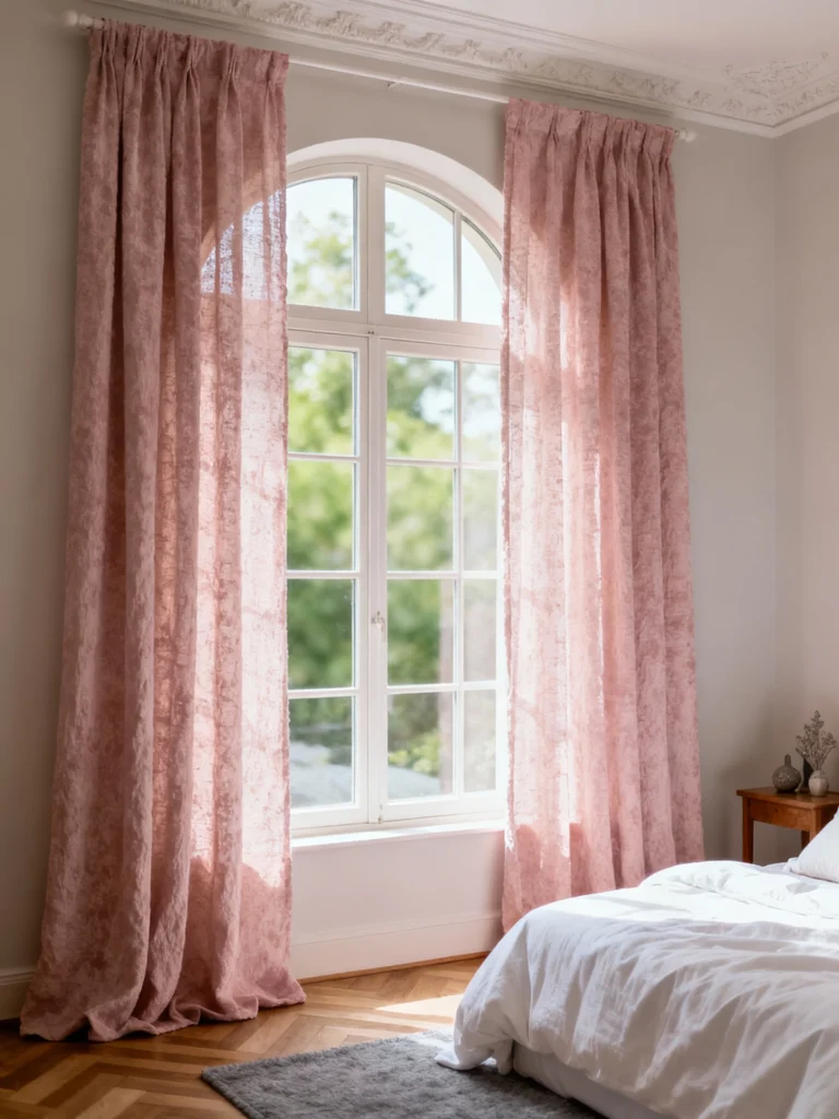 Window treatments in blush pink add a soft touch to a minimalist bedroom. Pairing these curtains with gold accents creates a lovely balance between elegance and simplicity. Choose lightweight fabrics to let in natural light while still providing privacy.