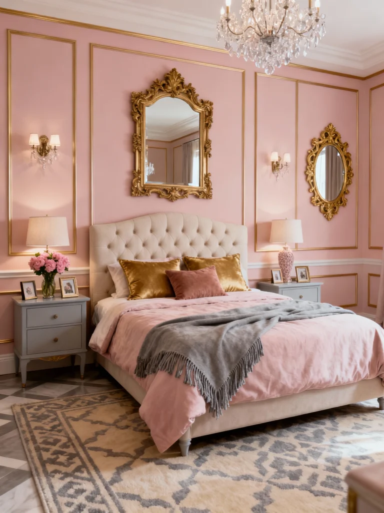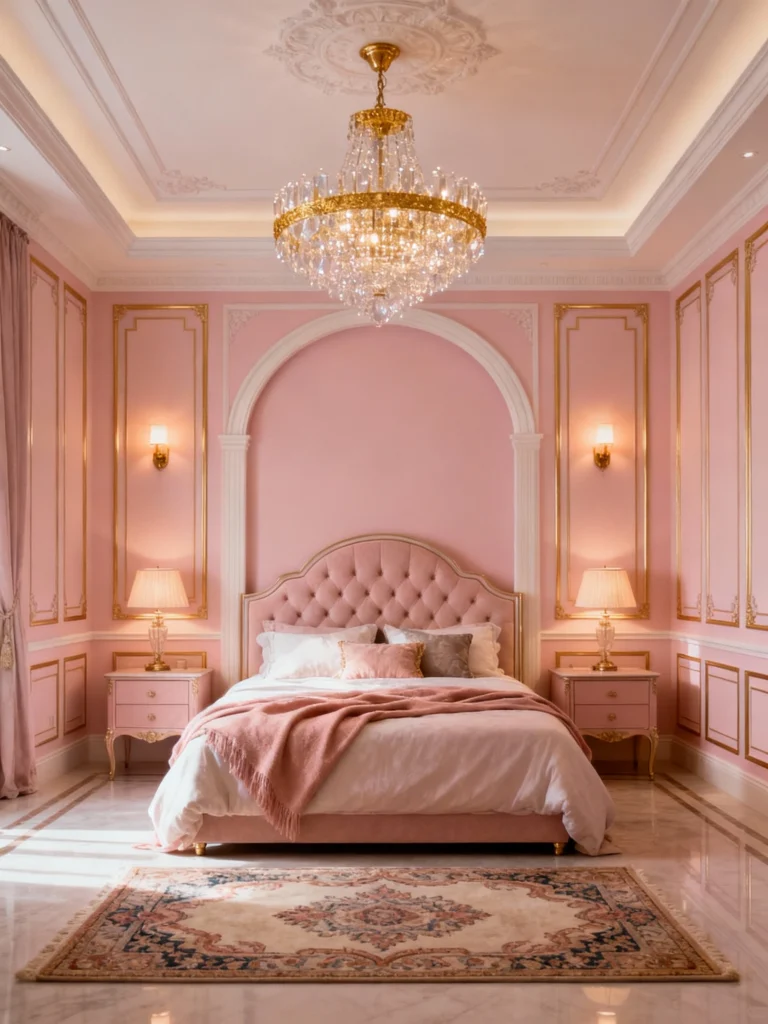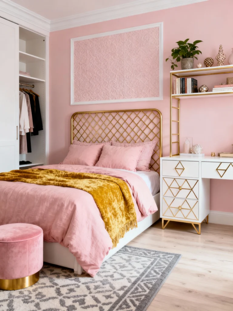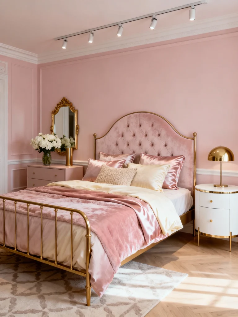 Achieve a refined Blush Pink And Gold Bedroom Adult aesthetic by pairing luxe metallic accents with minimalist decor. Use plush bedding and statement lighting for a cozy yet sophisticated feel.