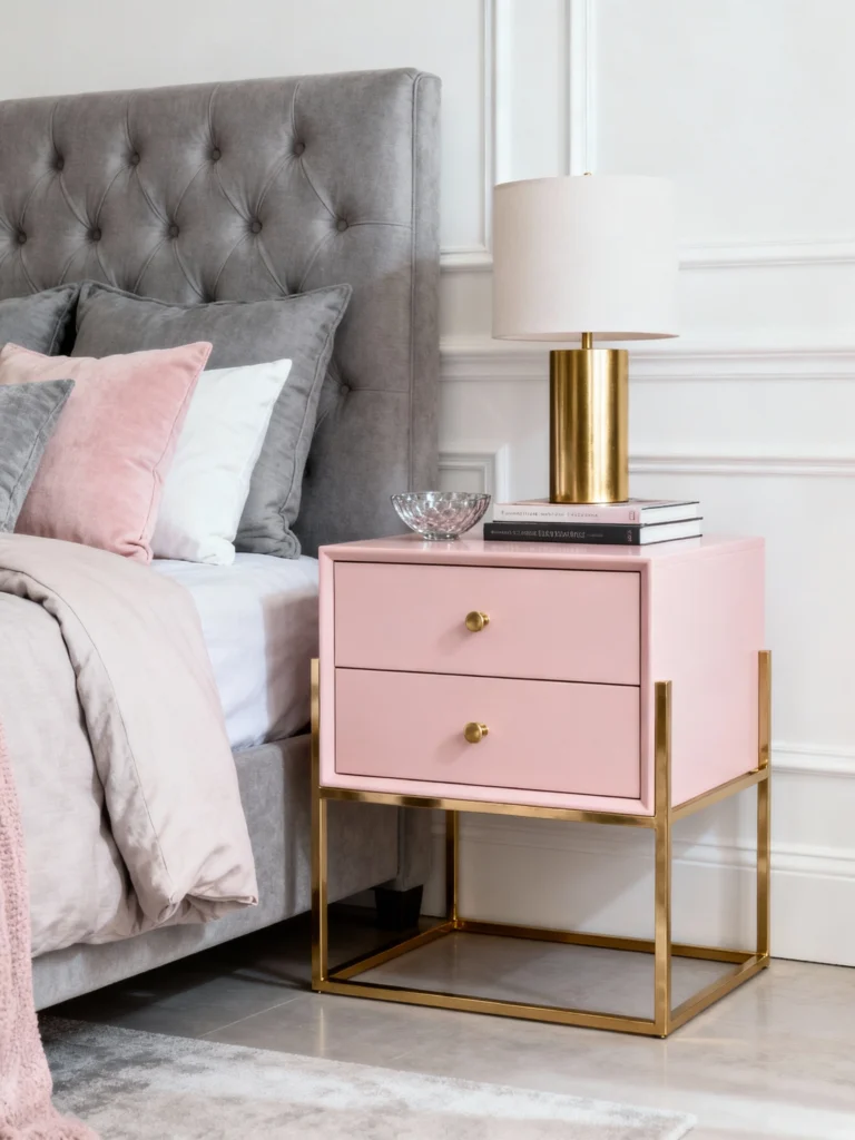 In a blush pink and gold bedroom, minimalist nightstands add a touch of elegance without overwhelming the space. Choose a nightstand with clean lines and a simple design to keep the focus on other decor elements. A pop of gold or a soft pink hue can bring a cohesive look to your serene sanctuary.