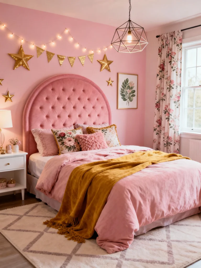Sleek gold furniture adds a touch of elegance to your blush pink and gold bedroom. The clean lines and shiny finishes create a chic look that isn’t too overwhelming. Plus, it complements the soft colors beautifully, making your space feel cozy yet stylish.