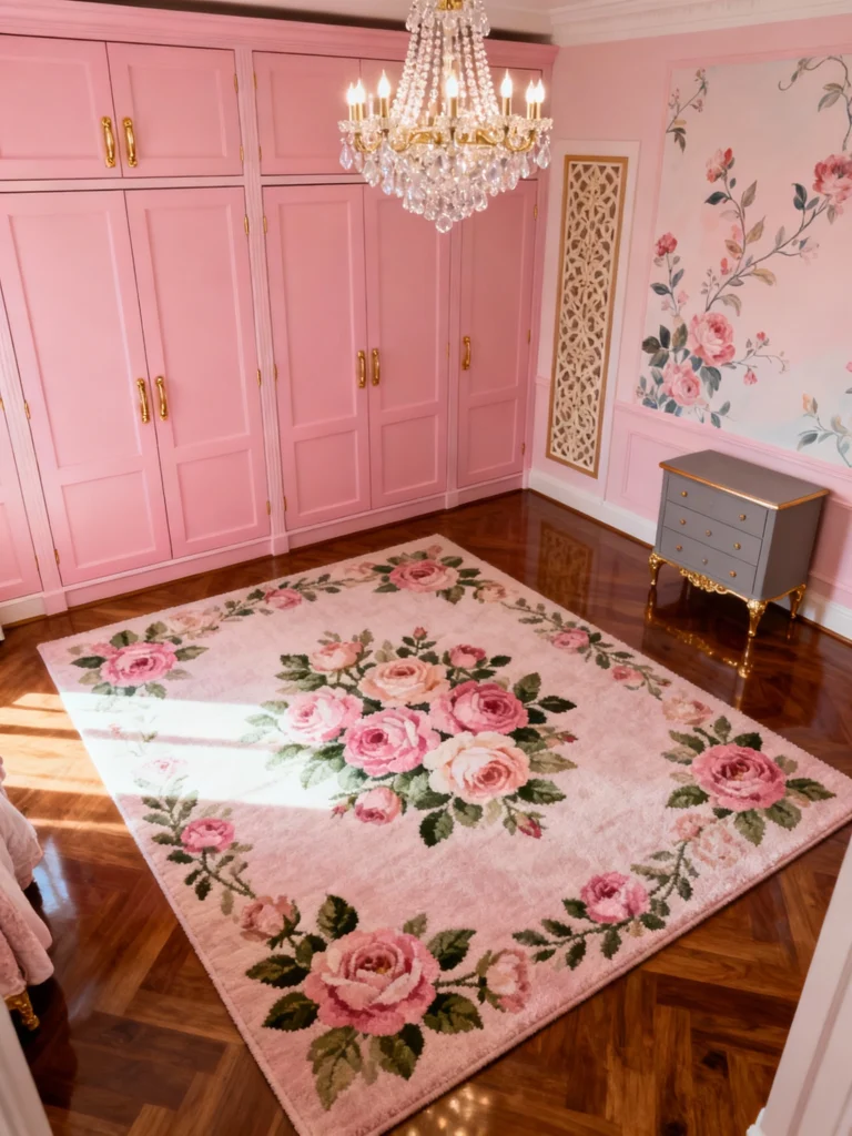 A stylish area rug can really tie your blush pink and gold bedroom together. Choose one with soft patterns that complement your decor without overwhelming the space. This not only adds a cozy touch but also brings a hint of glam that feels inviting and chic.