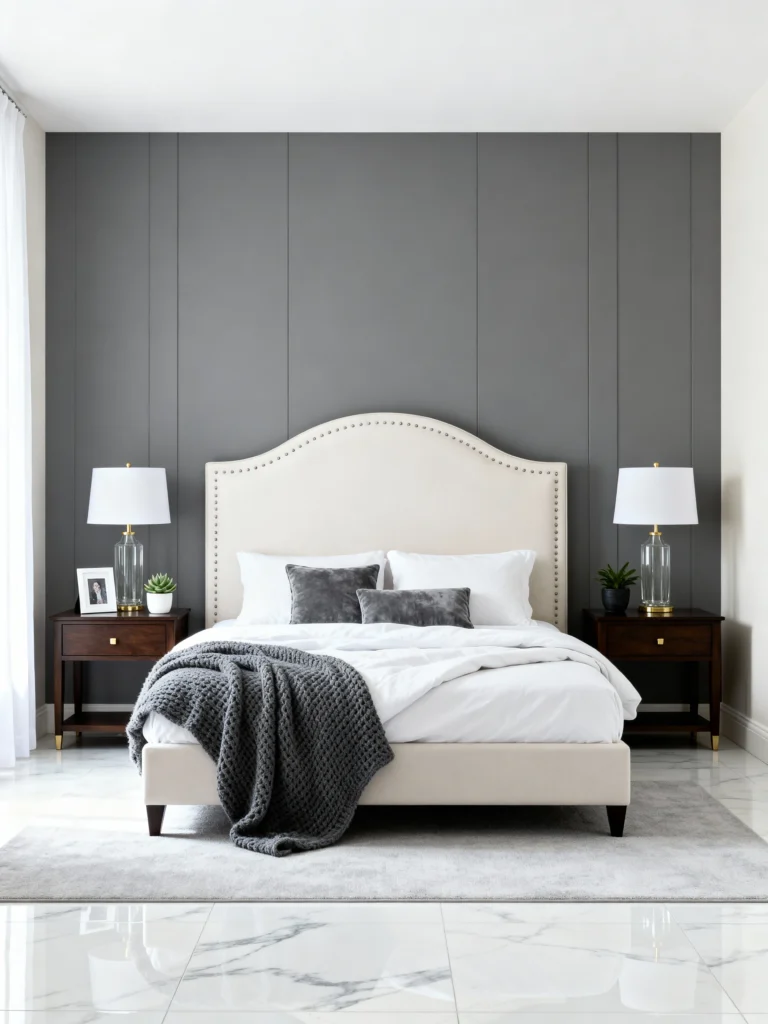 This is the ultimate in modern, relaxed sophistication. The charcoal grey accent wall, divided by simple vertical panels, provides a perfect, moody backdrop for the creamy, tufted bed. The dark nightstands and matching grey throw add a sense of grounding and depth. The high-gloss floor tile gives a clean, polished finish that reflects light beautifully.