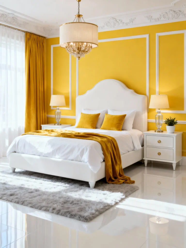 This room radiates luxury and warmth! The vibrant mustard yellow on the back wall, framed by crisp white molding, immediately draws the eye. The white tufted headboard, high-gloss floor, and gold-trimmed lighting amplify the glamorous, opulent feel. The matching throw and pillows tie the whole sunny look together, making it an incredibly inviting space.