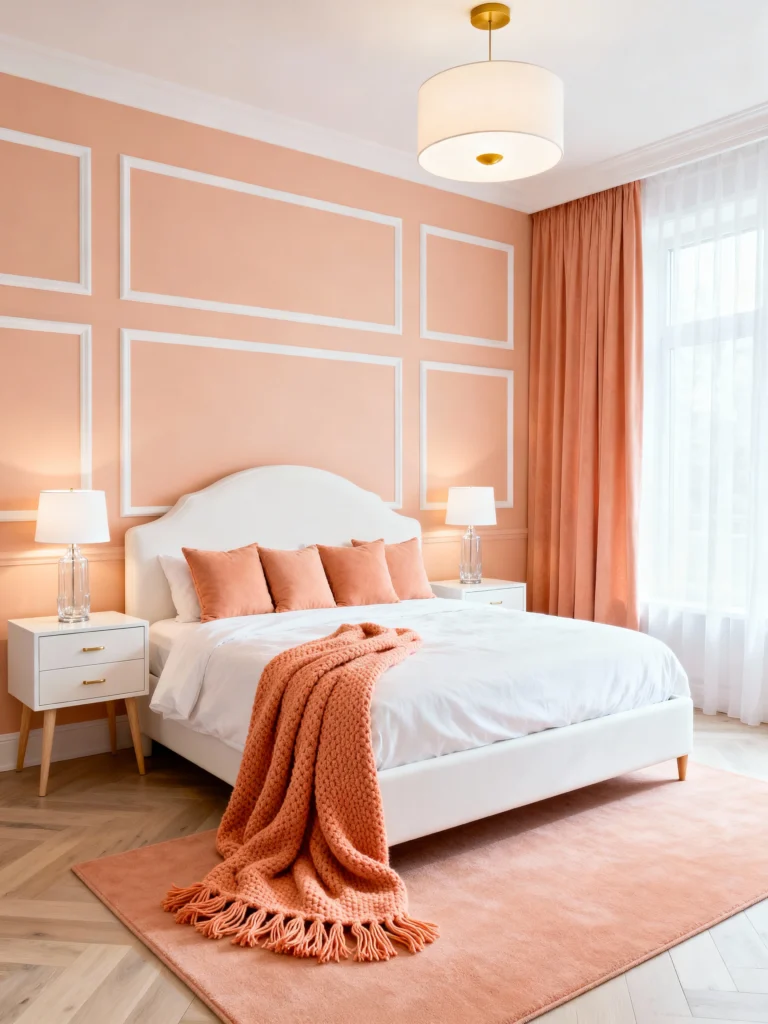 Talk about soft and serene! The light peach or soft coral wall color in this room creates an incredibly soothing atmosphere. It’s balanced beautifully with clean white bedding and sheer curtains that let in a ton of natural light. The monochromatic color scheme, from the wall to the rug and throw, feels modern and effortlessly chic.