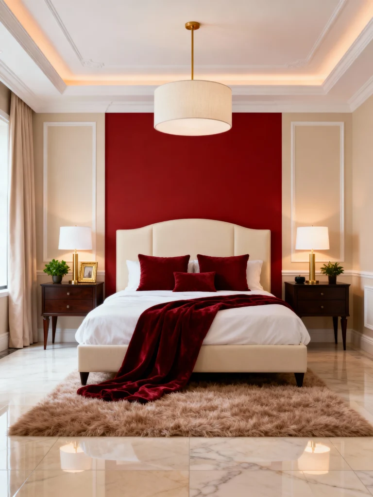 Need a dose of drama? This room delivers! The deep ruby red accent wall is bold and passionate. Keeping the side walls, ceiling, and trim a warm neutral cream prevents the red from becoming overwhelming. The matching velvet throw and pillows make the bed look incredibly lush and inviting—perfect for a cozy, romantic vibe.