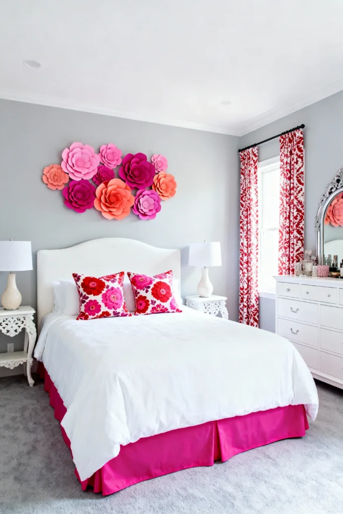Go big and bold with a massive 3D floral art installation right above your headboard. Choose varying shades of pink and orange to create a focal point that feels alive. Keep your bedding a crisp, clean white to balance the energy, but don’t be afraid to pull those bright colors down into a punchy pink bed skirt. Frame the windows with a classic red-and-white damask pattern to add a bit of sophisticated texture. It’s a playful, high-energy look that wakes you up with a smile every single morning.