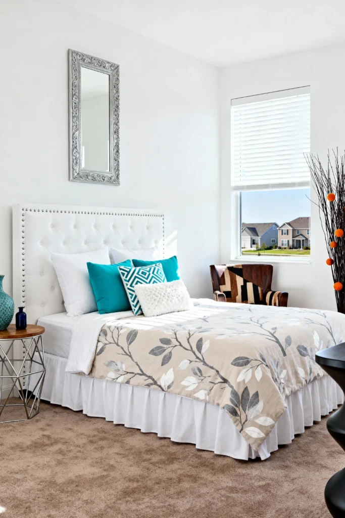 Go for a “bright and breezy” look by pairing a tufted white leather headboard with pops of vibrant teal. A botanical-print duvet in soft beige keeps the room feeling grounded, while a silver-framed vertical mirror adds a touch of classic elegance to the walls. Contrast the soft bedding with a modern, geometric silver side table for a bit of industrial edge. It’s a polished, well-balanced look that feels curated but totally comfortable for everyday lounging.