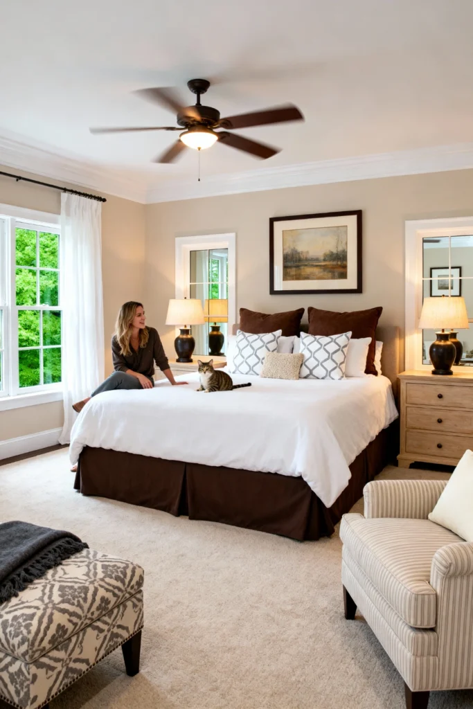 This is the “lived-in” look we all secretly want. It’s all about soft neutrals and layers. Start with a plush, oversized bed in chocolate brown and white, then add an upholstered bench with a fun pattern at the foot. Mirrors behind the bedside lamps help bounce light around, making the room feel twice as big. It’s a space designed for real life—complete with a comfy armchair for morning coffee and, of course, a spot for the cat!