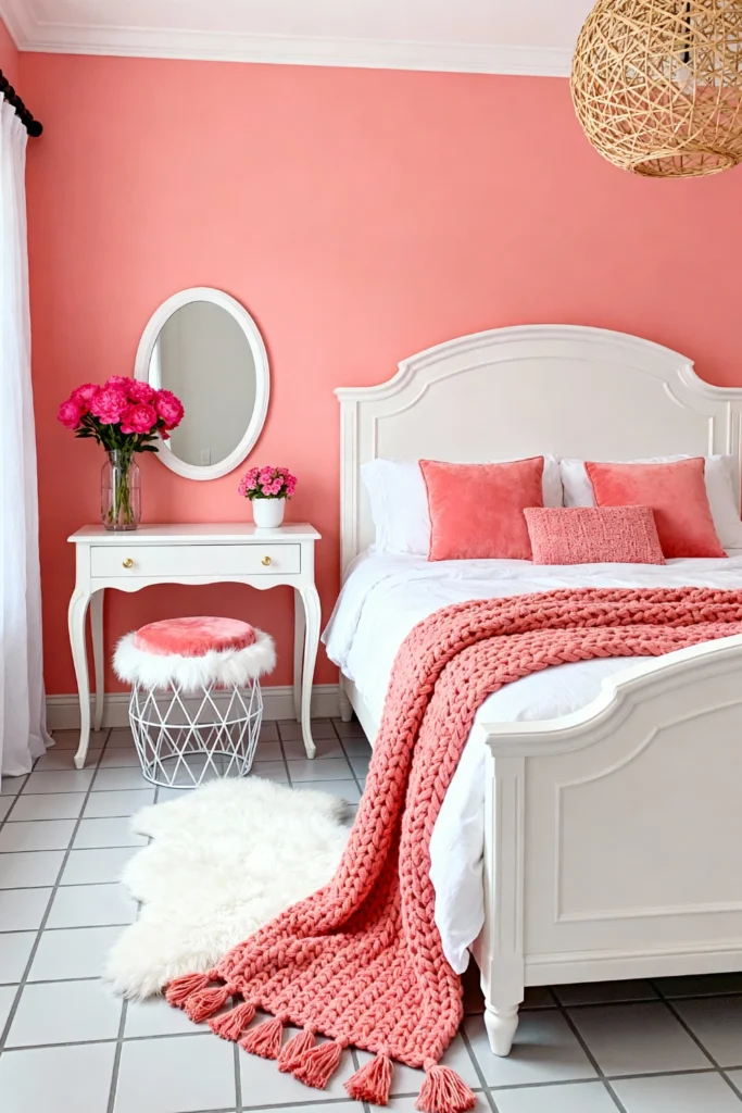 Who says pink is just for kids? This coral-walled wonder is proof that bold colors can be incredibly chic. The trick here is balance: keep your furniture white and curvy (love that vanity!) to let the wall color breathe. That chunky, oversized knit throw in a matching salmon tone is the ultimate “sink-in” accessory. It’s a cheerful, energetic space that feels like a warm hug. If you want a room that feels like a vacation, this is it.