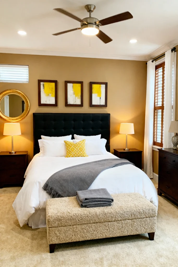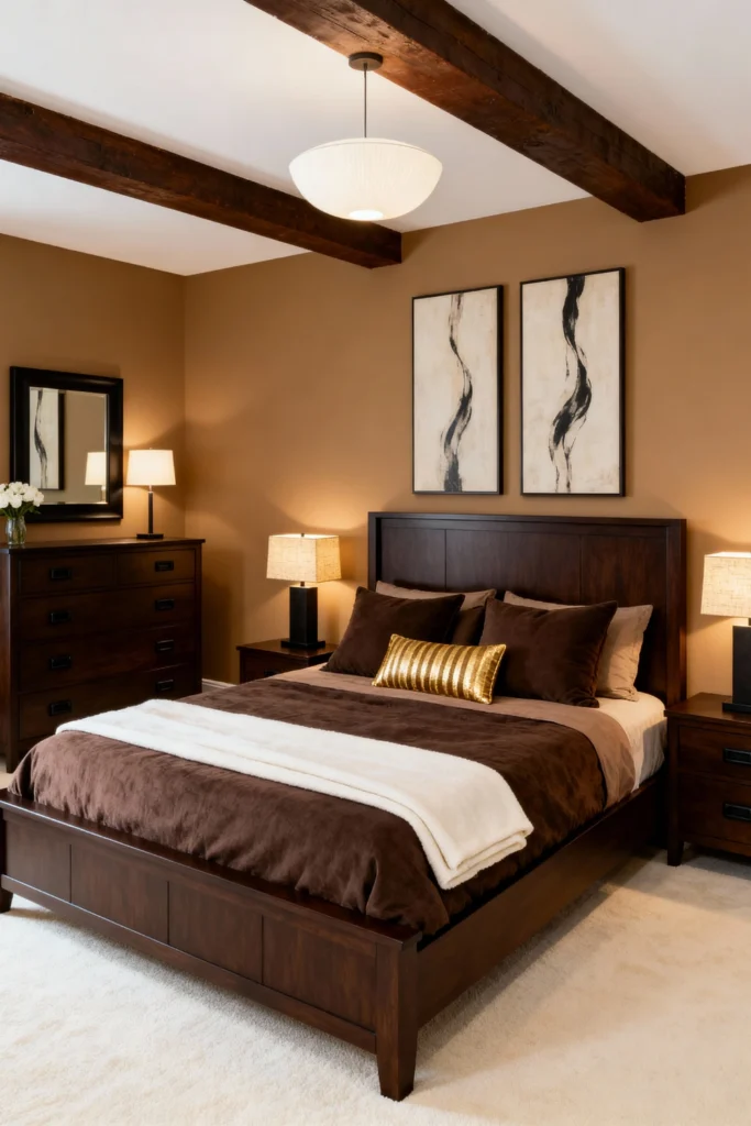 Lean into a monochromatic “coffee and cream” palette for a sophisticated, masculine edge. Use a dark espresso-stained wooden bed frame and matching dresser to ground the room. Paint the walls a warm camel tan to keep the space from feeling too dark. For a touch of luxury, place a shimmering gold lumbar pillow right in the center of your brown bedding. Flank the bed with oversized lamps featuring textured shades to cast a warm, golden glow across the room when the sun goes down.