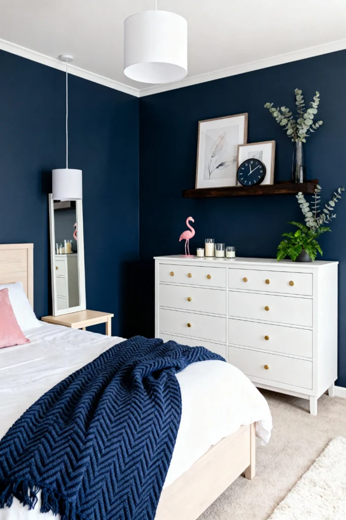 If you want a room that feels like a warm hug, paint your walls a deep, velvety navy. Contrast the dark backdrop with a bright white dresser and gold hardware for a touch of “glam meets cozy.” Add a simple wooden floating shelf to display minimalist sketches and a sleek black clock. For a pop of whimsy, tuck a tiny pink flamingo near your candles. Finish it off with a chunky, chevron-knit throw in a matching blue to layer on the texture without breaking the color palette.