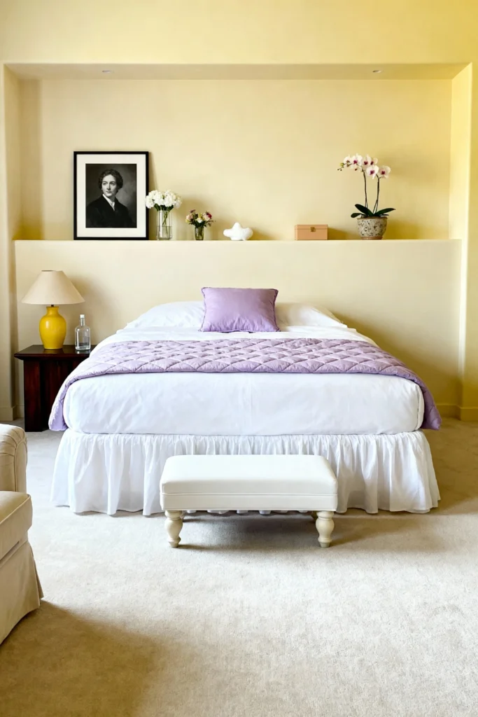 Create a sense of architectural depth with a recessed wall niche painted in a soft, buttery yellow. This built-in shelf is the perfect spot for a vintage portrait and a delicate orchid. Keep the furniture low and grounded—a dark wood nightstand paired with a bright yellow gourd lamp adds just the right amount of weight. Layer your bed with a lavender quilted coverlet for a color combination that feels like a spring garden. It’s a clean, serene setup that prioritizes breathing room and light.