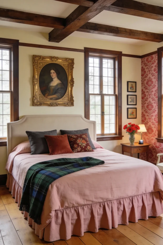 Embrace the “old world” charm by highlighting natural architecture like exposed ceiling beams. Hang a classic oil portrait in a heavy gold frame as your centerpiece to give the room an instant sense of history. Mix and match textures—think a soft dusty rose duvet paired with a traditional green plaid wool throw. A small wooden side table with a simple glass vase of red flowers keeps things feeling grounded and lived-in. It’s the ultimate “English countryside” vibe, perfect for curling up with a thick novel.