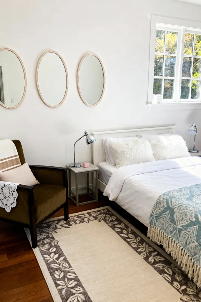 For a look that’s light as air, stick to a palette of white and cream but go heavy on the textures. Use shaggy, faux-fur pillows to make the bed look irresistibly soft. Hang a trio of identical oval mirrors on the wall to bounce light around and make the room feel twice as large. A moss-green velvet armchair in the corner provides a cozy spot for morning coffee, while a sage-patterned rug anchors the space. It’s clean, modern, and looks like a high-end boutique hotel suite.