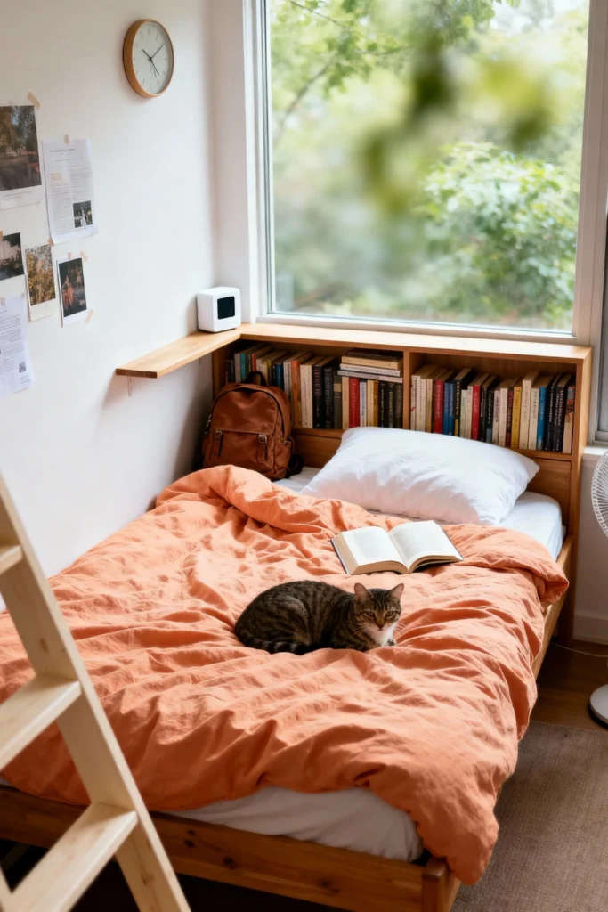 Maximize a small space by turning your headboard into a functional bookshelf filled with your favorite titles. Place your bed right under a large window to soak up the natural light while you read. Use a warm terracotta or apricot-colored duvet to give the room an earthy, organic feel. Keep the walls simple with a few taped-up polaroids and a classic wooden wall clock. If you have a cat, this sun-drenched spot will quickly become their favorite place (and yours) in the whole house.