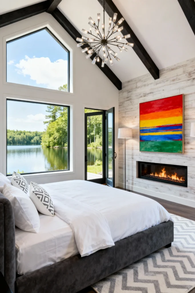 If you’re lucky enough to have high ceilings, emphasize them with dark-stained beams and a dramatic “starburst” chandelier. A whitewashed wood-plank accent wall adds a rustic touch behind a sleek, modern fireplace. Lean into primary colors for your art—a large, abstract canvas with stripes of red, yellow, and blue brings the whole room to life. Keep the bedding simple and white so the focus stays on the incredible view outside your floor-to-ceiling windows. This is high-impact, architectural living at its best.