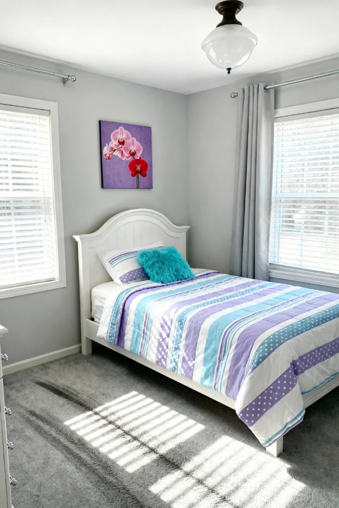 Create a youthful, breezy atmosphere with a mix of cool pastels. A white slatted headboard feels timeless, especially when paired with a striped comforter in shades of lilac and turquoise. Add a single “fun” element, like a bright teal shaggy pillow, to break up the patterns. A simple orchid print on a purple canvas ties the floral theme together without being overwhelming. This look is all about soft light and easy-going energy—perfect for a guest room or a teenager’s retreat.