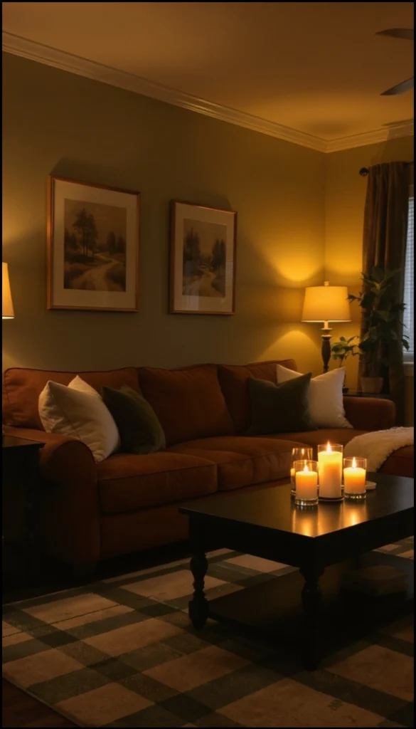 - Layer the Mood: Use a mix of lamps and LED candles (for safety!) on the coffee table.