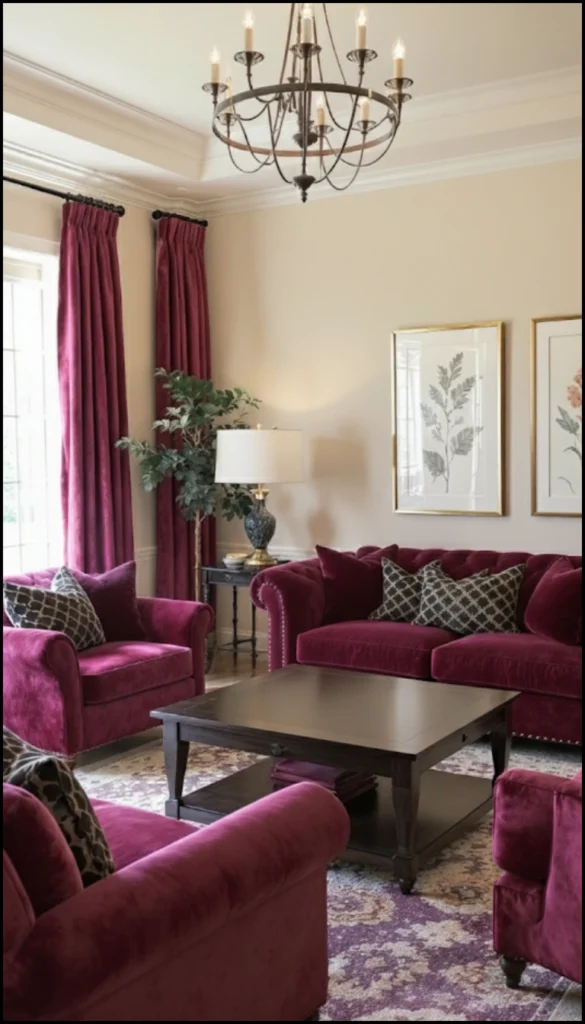 Pure luxury! The rich, deep magenta velvet on the couch and chairs gives this traditional room an opulent, dramatic feel. It’s like a sophisticated cocktail lounge right in your home. Paired with the elegant chandelier and the soft cream walls, the bold furniture colors don’t feel overwhelming, just incredibly chic and inviting.