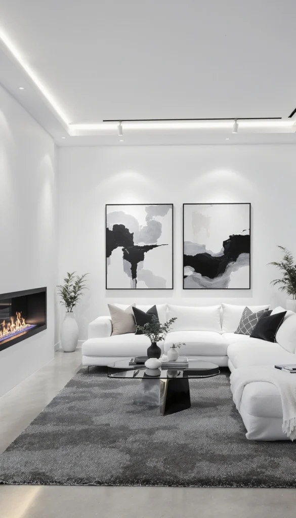 Crisp, clean, and incredibly stylish! This living room masters the art of monochromatic design using only black, white, and varying shades of gray. The sleek, low-profile white sectional and minimalist fireplace create a modern, gallery-like feel. The large abstract art pieces provide high contrast and act as a powerful focal point.