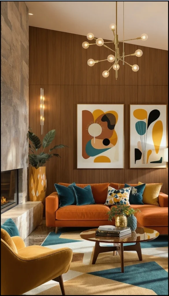Talk about a burst of joy! This space screams mid-century modern with a bold, contemporary twist. The burnt orange velvet couch is the star, perfectly complemented by the geometric artwork and rich, vertical wood paneling. The mix of teal, mustard, and rust creates a vibrant, playful energy that makes this room feel instantly happy.
