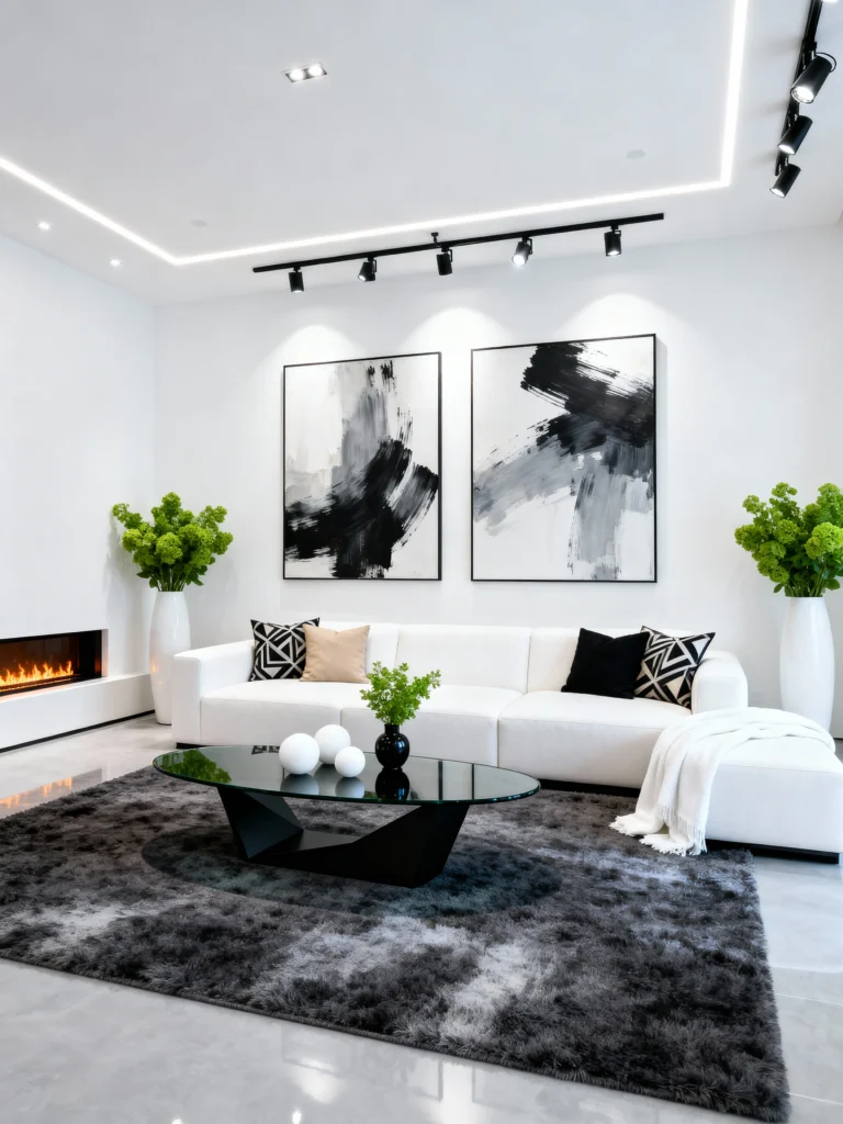 - Track Lighting: Use recessed or modern track lighting to highlight your artwork and clean lines.