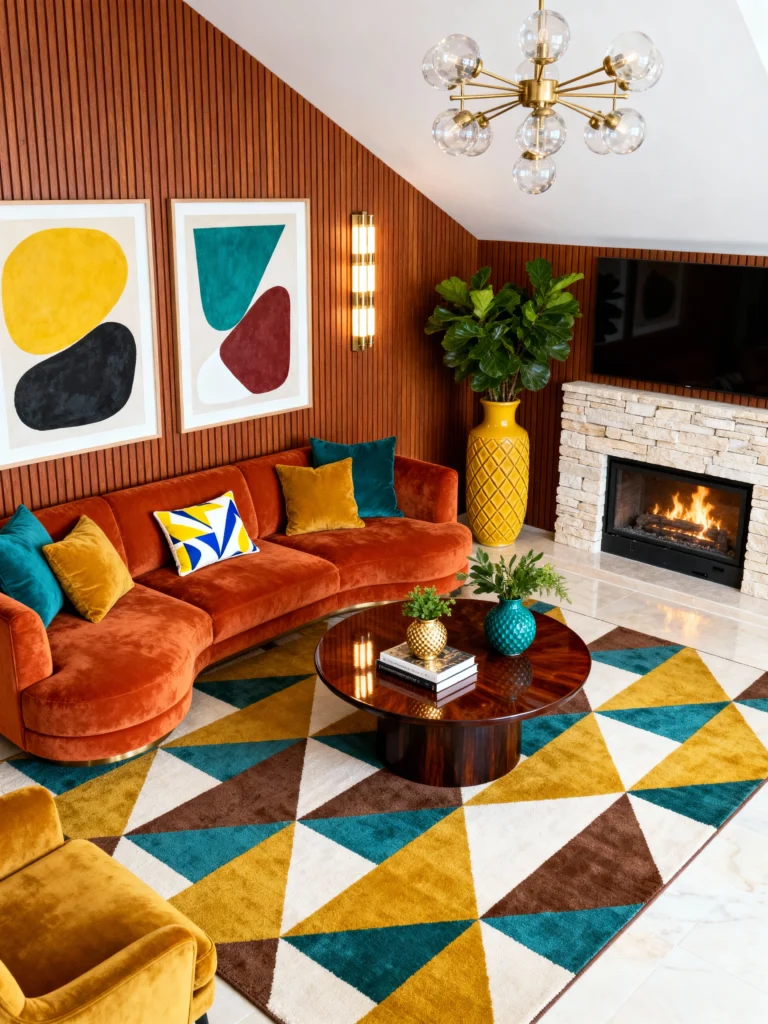 Talk about a burst of joy! This space screams mid-century modern with a bold, contemporary twist. The burnt orange velvet couch is the star, perfectly complemented by the geometric artwork and rich, vertical wood paneling. The mix of teal, mustard, and rust creates a vibrant, playful energy that makes this room feel instantly happy.