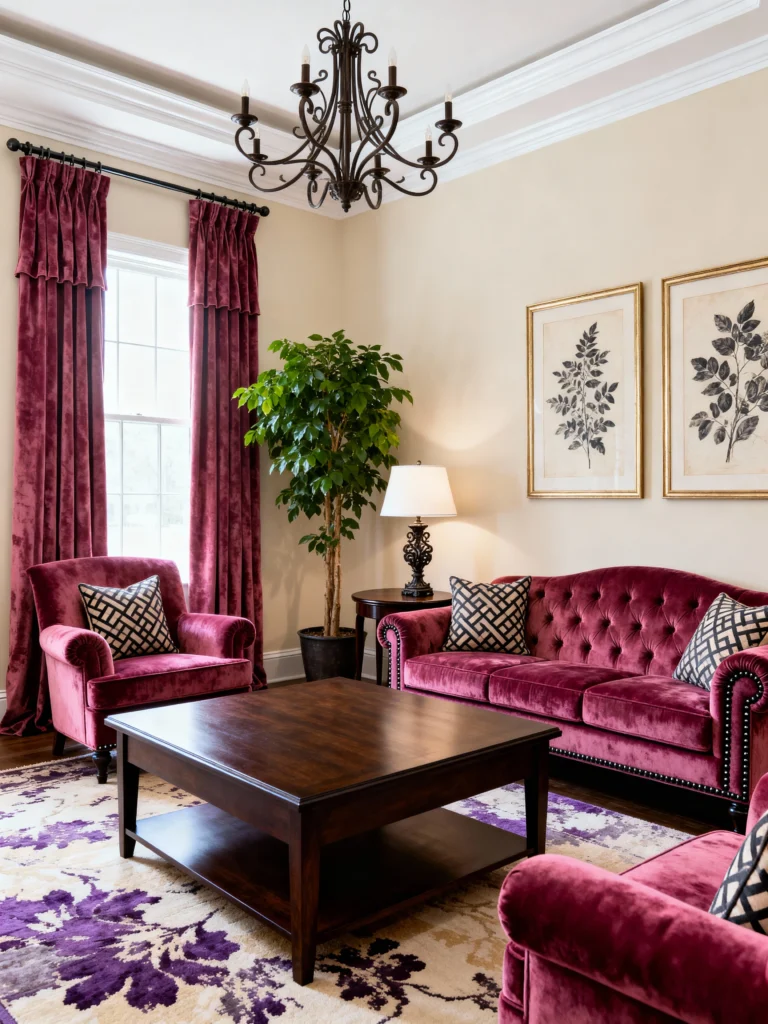 Pure luxury! The rich, deep magenta velvet on the couch and chairs gives this traditional room an opulent, dramatic feel. It’s like a sophisticated cocktail lounge right in your home. Paired with the elegant chandelier and the soft cream walls, the bold furniture colors don’t feel overwhelming, just incredibly chic and inviting.