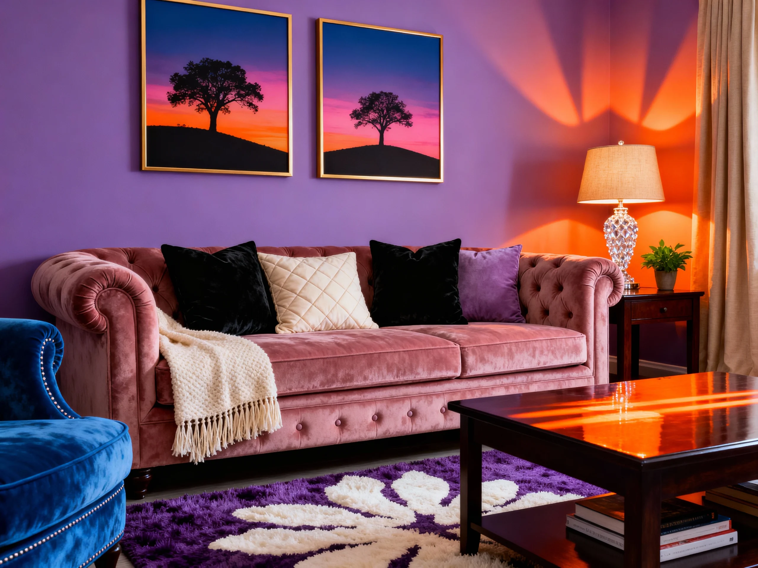 Go bold with lilac walls and a soft, dusty pink velvet sofa for a dreamy vibe. The key here is lighting—use a warm lamp to cast sunset-like shadows that make the room feel magical. Throw on some geometric pillows in black and cream for necessary contrast. A fluffy purple rug anchors the space, making it feel like a cozy, colorful hideaway that is full of personality.