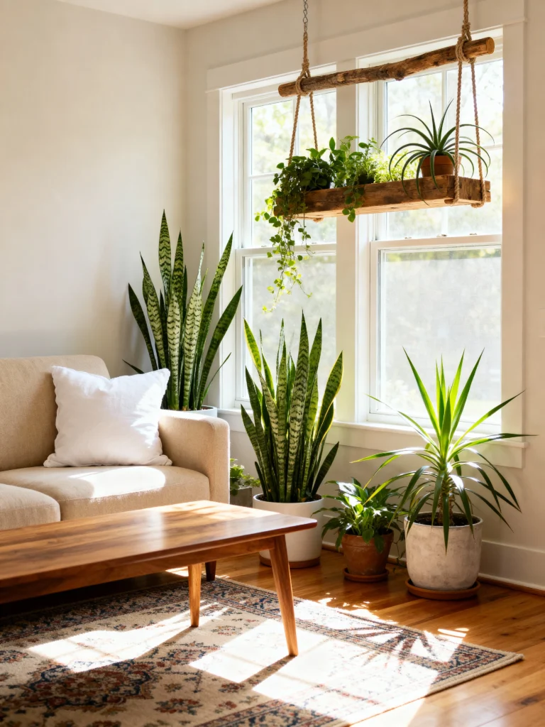 Plants are a must for enhancing the natural vibe of your living room. Choose low-maintenance plants like snake plants, pothos, or succulents.
