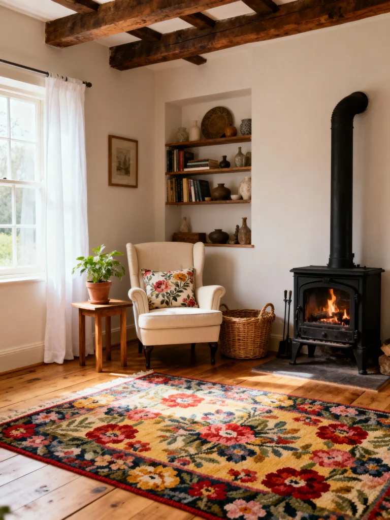 Textiles are key to creating a cozy cottagecore living room. Layer rugs, throw blankets, and pillows to add warmth and texture.