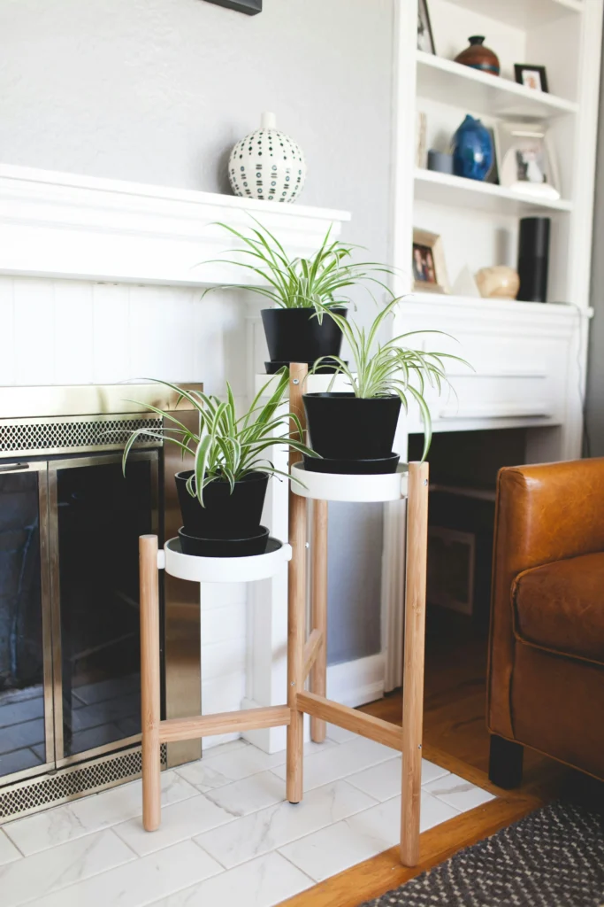 Spider plants in sleek black pots on a light bamboo stand? Yes, please! This three-tiered setup is perfect for tucking into an empty corner right by your TV wall unit. The high contrast between the dark pots and the bright green leaves makes a seriously strong impact. It keeps your floor uncluttered while adding a purposeful, modern touch that blends flawlessly with contemporary aesthetics.