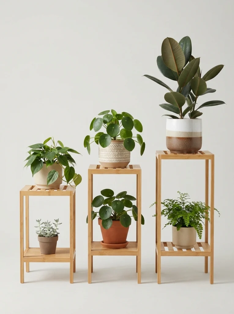 varying the heights of your plants adds instant visual interest. These slender, light wood stands are perfect for elevating your favorite pieces. Minimalist style thrives on clean lines, so letting a bold rubber plant or a delicate fern take center stage works beautifully. Keeping the stands simple allows each unique pot and leaf texture to stand out beautifully against a blank wall.
